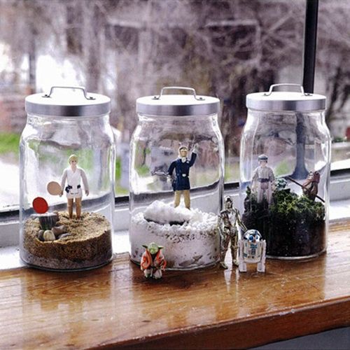 Cuando he visto en Ohdeedoh estos botes de cristal con figuras de La Guerra de las Galaxias he pensado que eran una genial estrategia para decorar la habitación de los peques, sobre todo cuando se van haciendo mayores y dejan de jugar con pequeñas figuras que les encantaban antes. Pero también es una opción impactante, al tiempo que económica, para decorar una fiesta temÔtica.