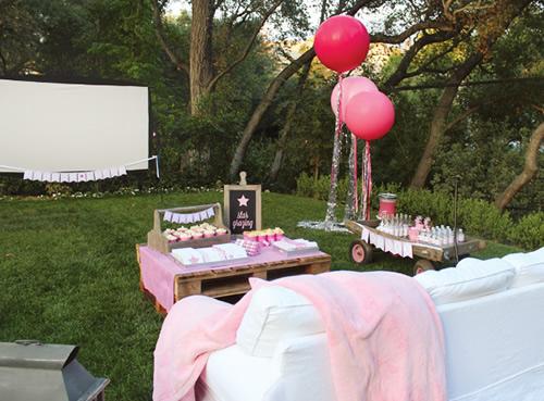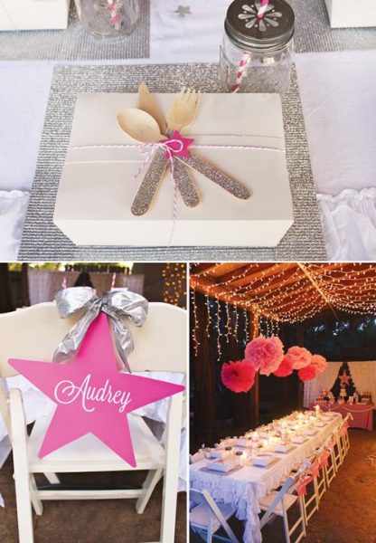 Menuda fiesta! incluso han pensado en la decoración para cuando se haga de noche, luces que hacen resaltar los adornos rosas de la mesa. Ha quedado una fiesta muy chic.